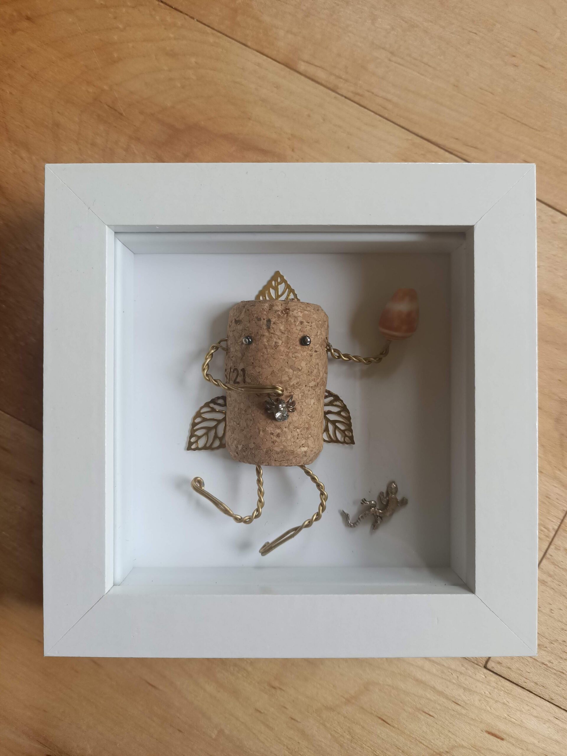 Handmade corkbot in 3D frame, made from leftover things